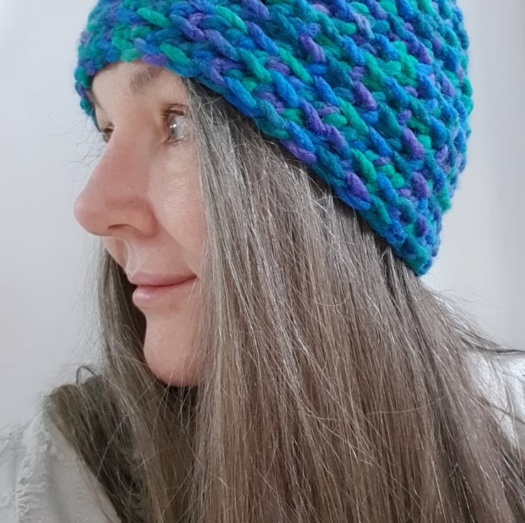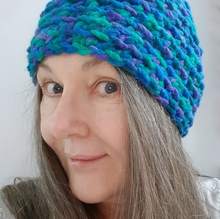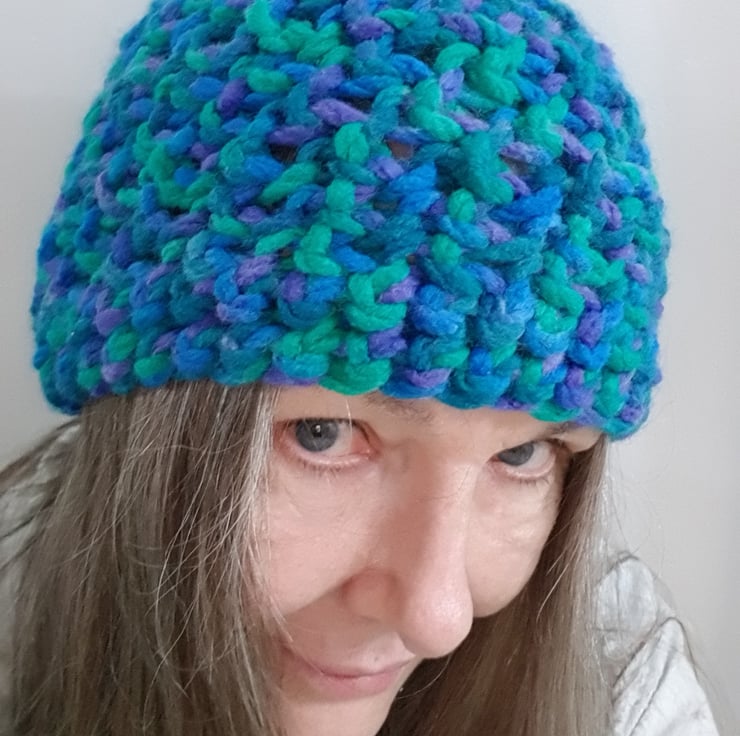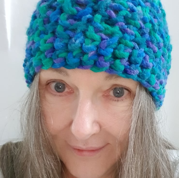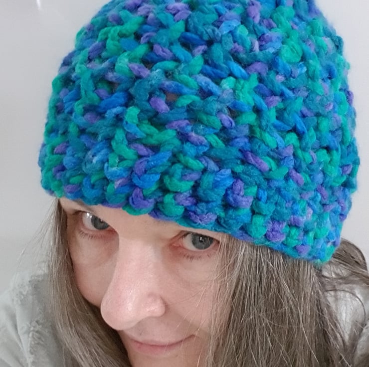 Hand made crochet hat. 100% Acrylic. I never use patterns or repeat, making each piece an original. No two of my hats are the same. Worn as a regular beanie. All hats have my Flea Laney tag. Medium size. Tight fit.