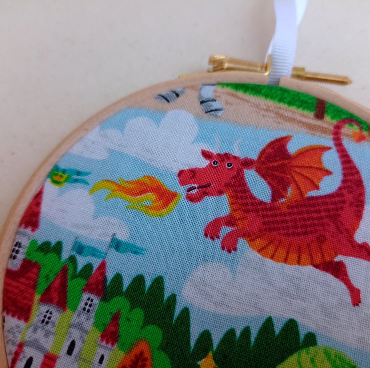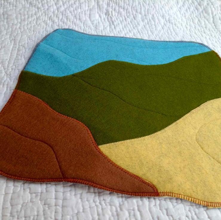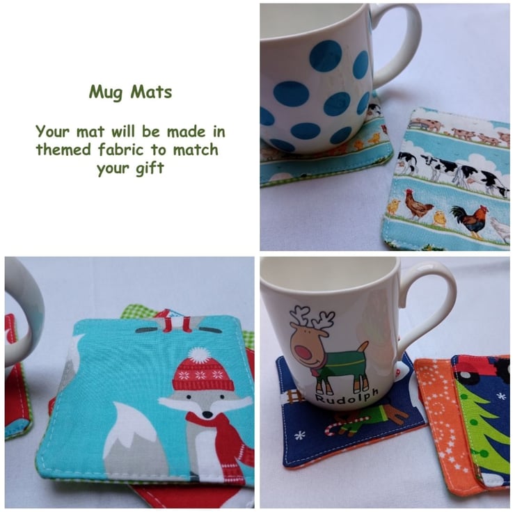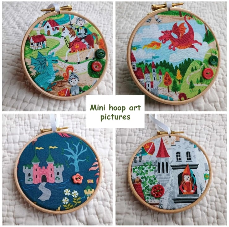 The gift box is based around one of my lovely felt play scenes, which are reversible play mats ideal for both themed and open ended play, and comes with a lined cotton drawstring bag to hold your child's little toy figures. I have added a felt bookmark to use with fairy-tale books, and a card printed with my hand embroidered fire breathing dragon. Plus an optional mug mat and .