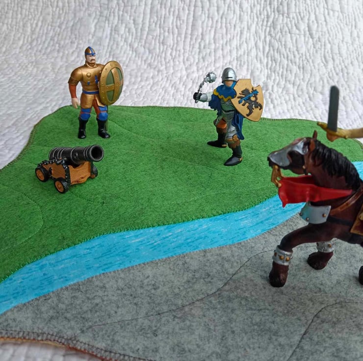 My play mats are designed for use with any small-play figures, such as the 2-3 inch toys in the photos (not included). They are tested to EN71 standards and UKCA marked. Recommended for age 18 months and over.