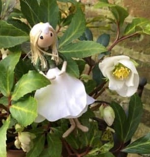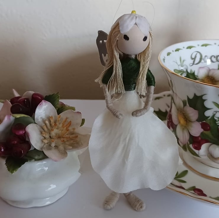 This delicate little Christmas Rose fairy is our design for Winter 24/35. She's based on the Hellebore flower wearing a dark green bodice, a skirt of delicate creamy white petals and a bright yellow organza underskirt.. With a loop of 'invisible' thread, she's ready to adore a Christmas tree but can stay out to decorate your home until the spring!