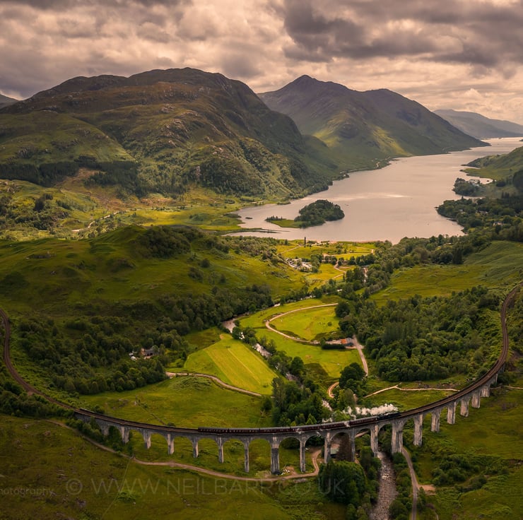 Image: "Glenfinnan" - The Jacobite train service crossing Glenfinnan Viaduct, 2 July 2019 - by Scotland photographer Neil Barr