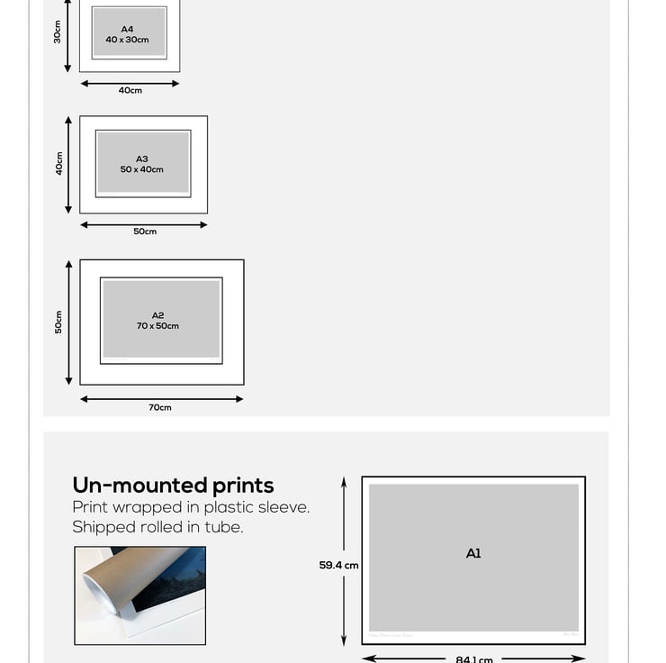 See menu (Shop collections) for different sizes & framed/unframed options. Images are organised by size & unframed or framed. Images are available in all sizes (except panoramas) from A6 to A2. See menu (Shop collections) for different options. Frames are available for delivery up to the A3 size paper in Black, White or Oak.