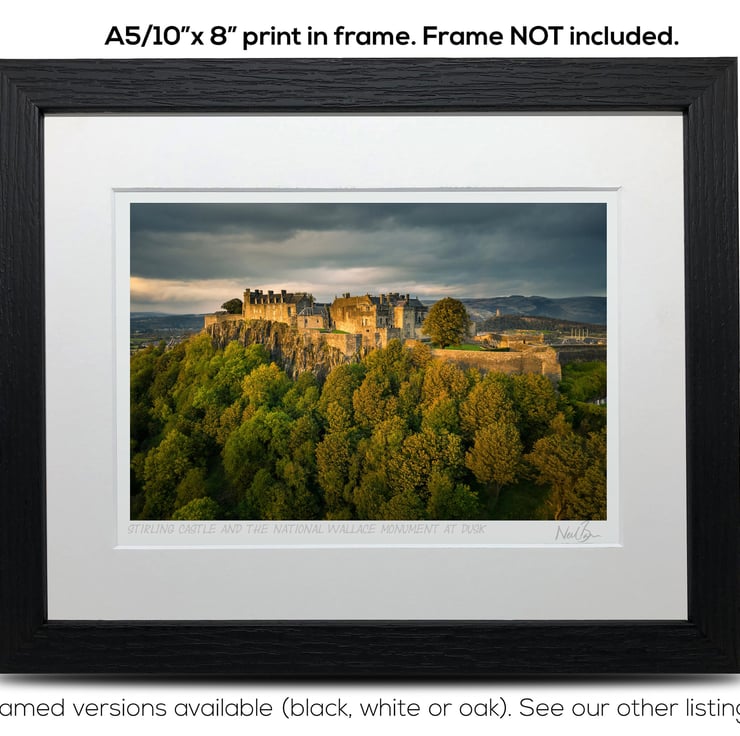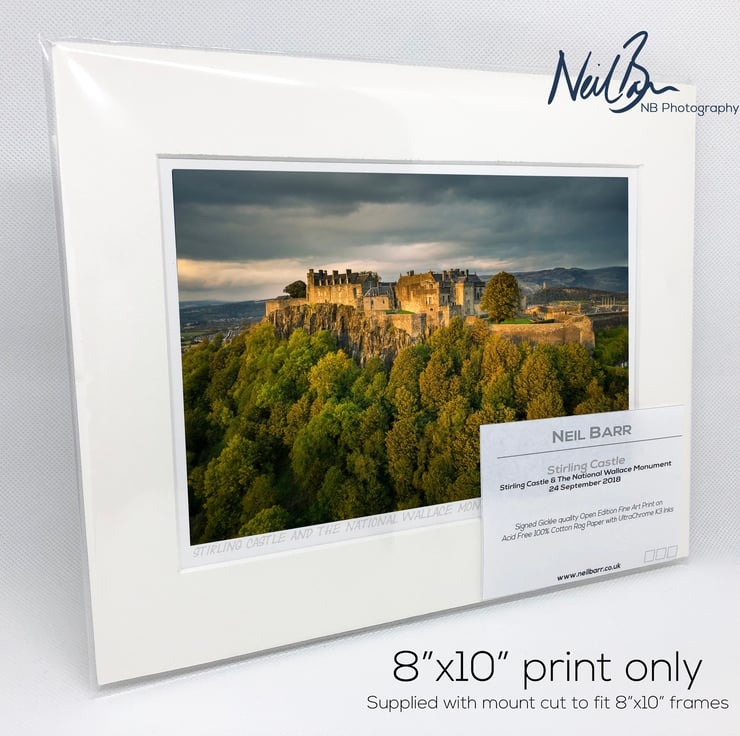 Supplied already mounted, wrapped & with signed labels & certificate, the image is printed on A5 size fine art paper (148x210mm). The actual image size is smaller (see listing images for sizes - image approx. 185x123mm) to allow for the signature & inscription. The 100% acid-free mount is cut to fit standard ready-made frames from high street stores. EXTERNAL mount size is 10"x8". This is the OUTSIDE size of the mount (and thus the size your frame should be).