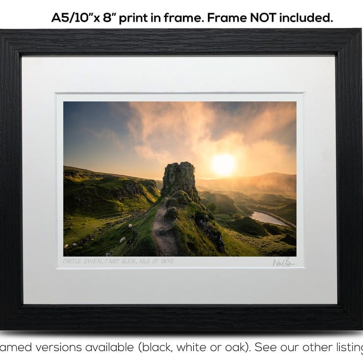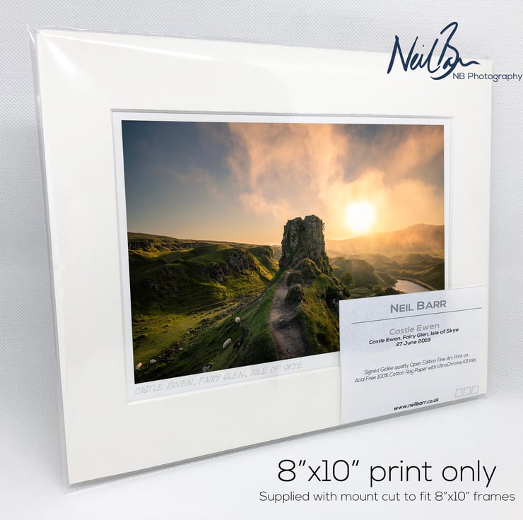 Supplied already mounted, wrapped & with signed labels & certificate, the image is printed on A5 size fine art paper (148x210mm). The actual image size is smaller (see listing images for sizes - image approx. 185x123mm) to allow for the signature & inscription. The 100% acid-free mount is cut to fit standard ready-made frames from high street stores. EXTERNAL mount size is 10"x8". This is the OUTSIDE size of the mount (and thus the size your frame should be).