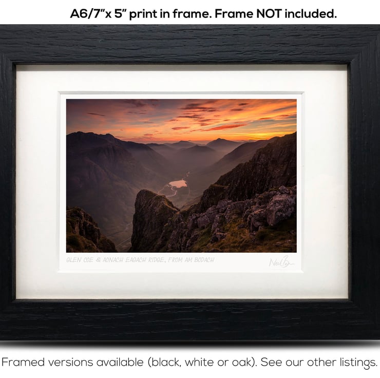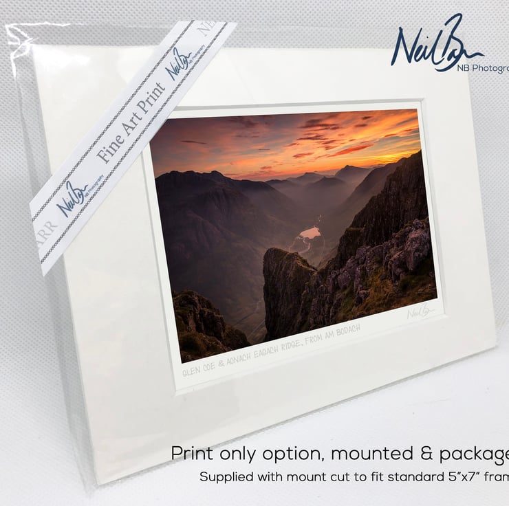 Supplied already mounted, wrapped & with signed labels & certificate, the image is printed on A6 size fine art paper (148x105mm). The actual image size is smaller (see listing images for sizes - image approx. 115x77mm) to allow for the signature & inscription. The 100% acid-free mount is cut to fit standard ready-made frames from high street stores. EXTERNAL mount size is 7"x5". This is the OUTSIDE size of the mount (and thus the size your frame should be).