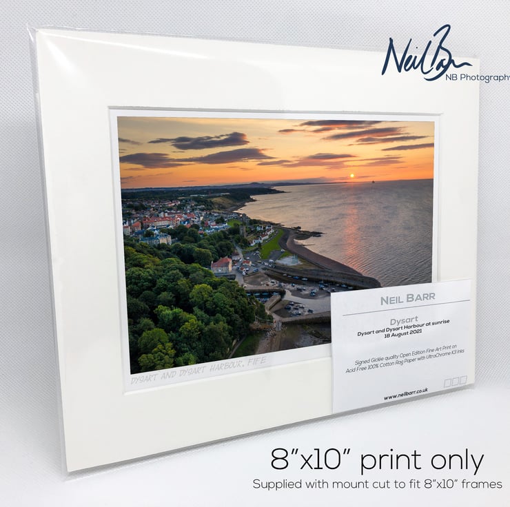 Supplied already mounted, wrapped & with signed labels & certificate, the image is printed on A5 size fine art paper (148x210mm). The actual image size is smaller (see listing images for sizes - image approx. 185x123mm) to allow for the signature & inscription. The 100% acid-free mount is cut to fit standard ready-made frames from high street stores. EXTERNAL mount size is 10"x8". This is the OUTSIDE size of the mount (and thus the size your frame should be).