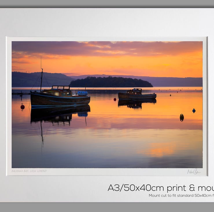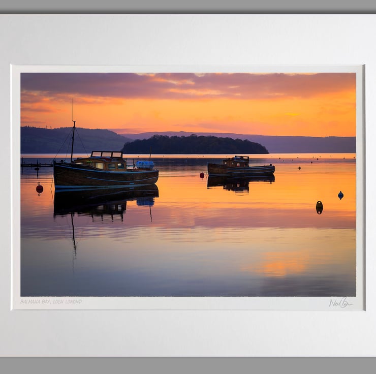 Image: "Boats at Balmaha Bay" - Balmaha Bay, Loch Lomond at sunset, 9 November 2014 - by Scotland photographer Neil Barr