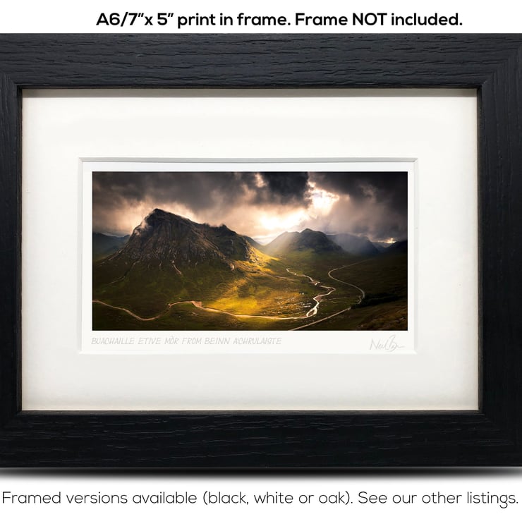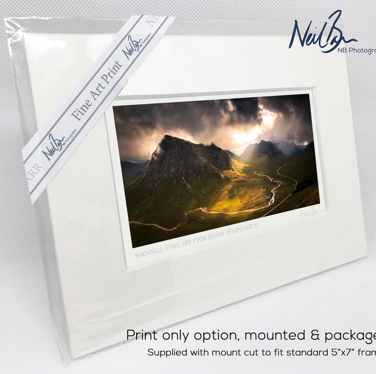 Supplied already mounted, wrapped & with signed labels & certificate, the image is printed on A6 size fine art paper (148x105mm). The actual image size is smaller (see listing images for sizes - image approx. 115x58mm) to allow for the signature & inscription. The 100% acid-free mount is cut to fit standard ready-made frames from high street stores. EXTERNAL mount size is 7"x5". This is the OUTSIDE size of the mount (and thus the size your frame should be).