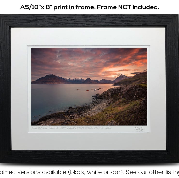 Supplied already mounted, wrapped & with signed labels & certificate, the image is printed on A5 size fine art paper (148x210mm). The actual image size is smaller (see listing images for sizes - image approx. 185x123mm) to allow for the signature & inscription. The 100% acid-free mount is cut to fit standard ready-made frames from high street stores. EXTERNAL mount size is 10"x8". This is the OUTSIDE size of the mount (and thus the size your frame should be).