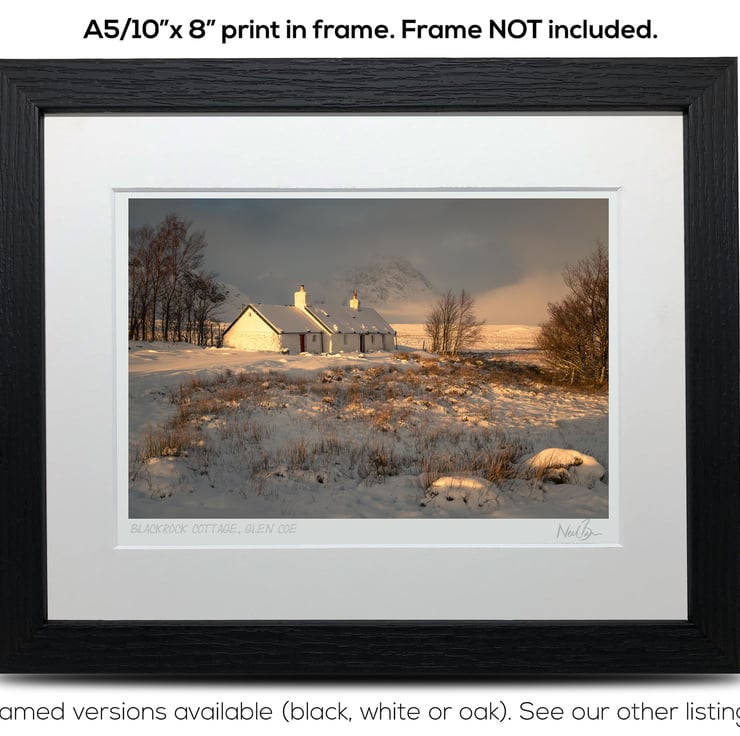 Supplied already mounted, wrapped & with signed labels & certificate, the image is printed on A5 size fine art paper (148x210mm). The actual image size is smaller (see listing images for sizes - image approx. 185x123mm) to allow for the signature & inscription. The 100% acid-free mount is cut to fit standard ready-made frames from high street stores. EXTERNAL mount size is 10"x8". This is the OUTSIDE size of the mount (and thus the size your frame should be).