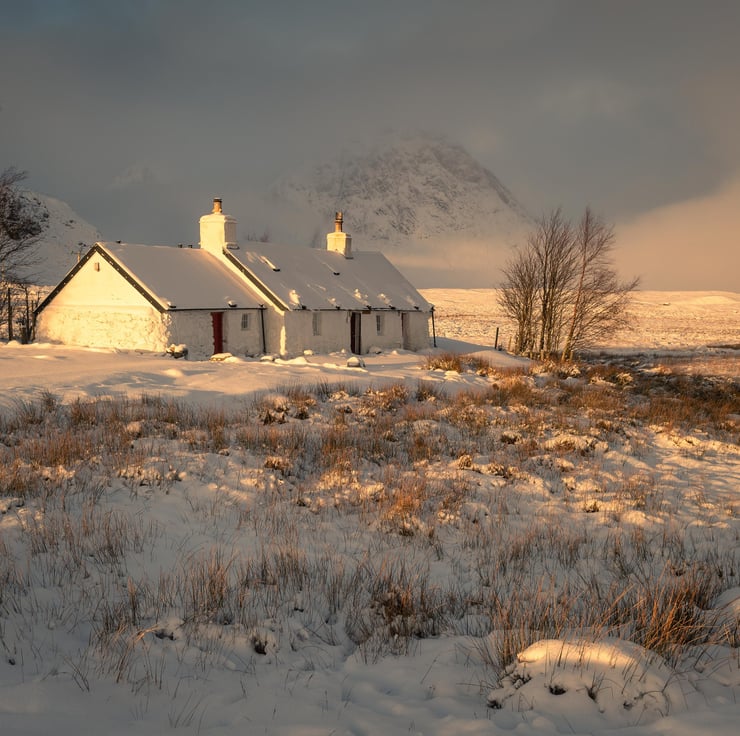 Image: "Blackrock Cottage" - Blackrock Cottage at the Glencoe Mountain Resort on a snowy morning, 30 January 2019 - by Scotland photographer Neil Barr