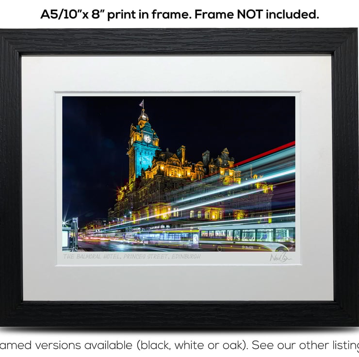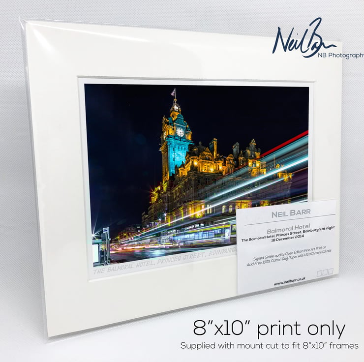 Supplied already mounted, wrapped & with signed labels & certificate, the image is printed on A5 size fine art paper (148x210mm). The actual image size is smaller (see listing images for sizes - image approx. 185x123mm) to allow for the signature & inscription. The 100% acid-free mount is cut to fit standard ready-made frames from high street stores. EXTERNAL mount size is 10"x8". This is the OUTSIDE size of the mount (and thus the size your frame should be).