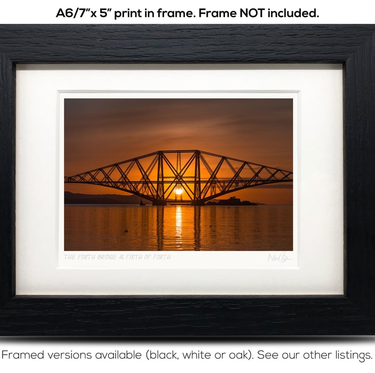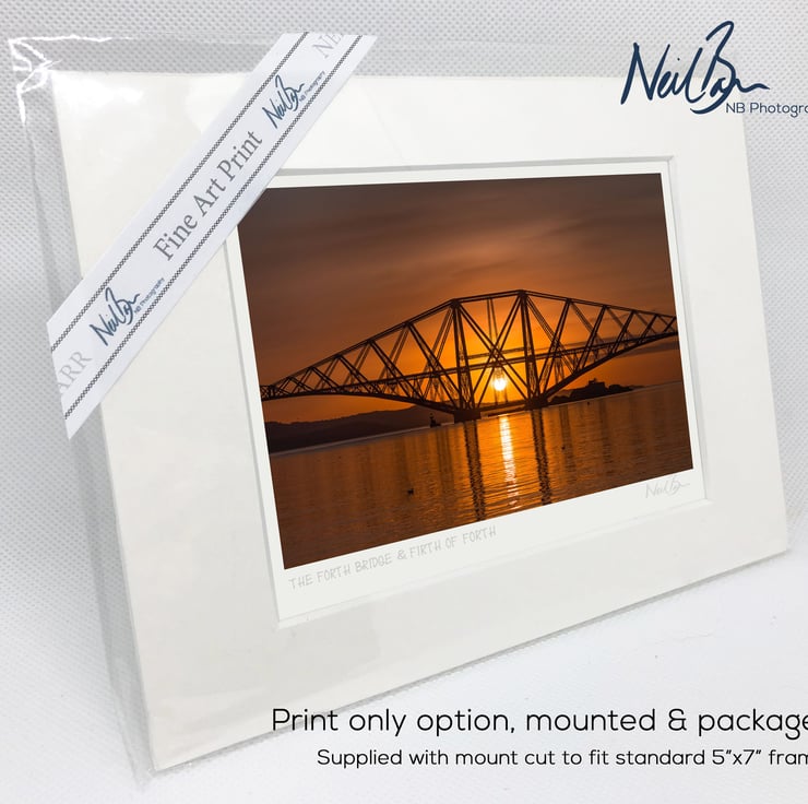 Supplied already mounted, wrapped & with signed labels & certificate, the image is printed on A6 size fine art paper (148x105mm). The actual image size is smaller (see listing images for sizes - image approx. 115x77mm) to allow for the signature & inscription. The 100% acid-free mount is cut to fit standard ready-made frames from high street stores. EXTERNAL mount size is 7"x5". This is the OUTSIDE size of the mount (and thus the size your frame should be).