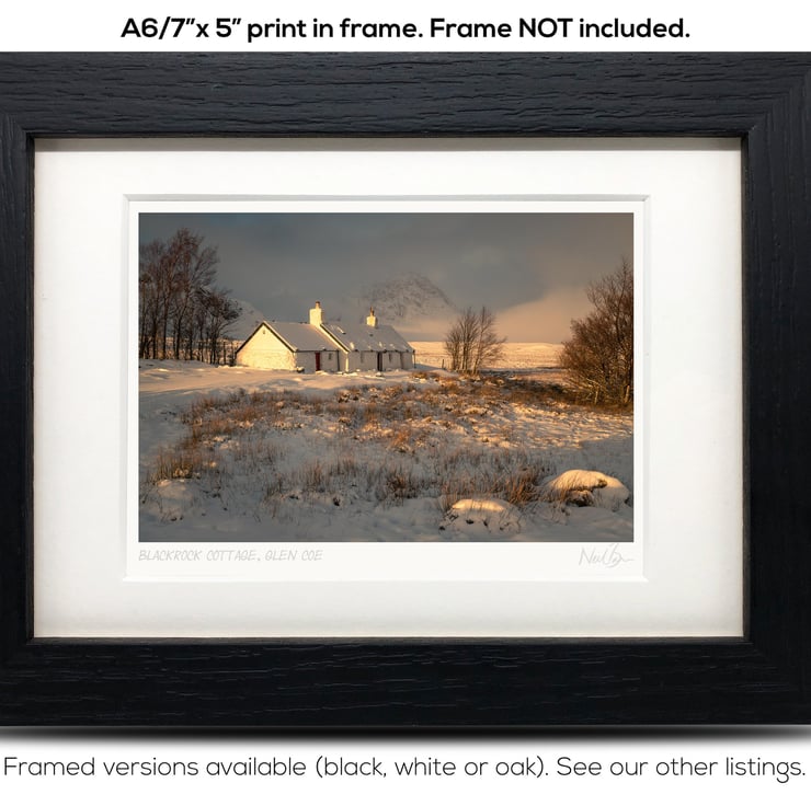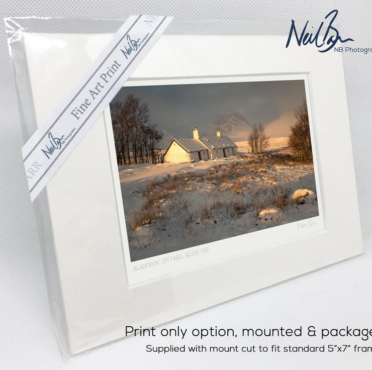 Supplied already mounted, wrapped & with signed labels & certificate, the image is printed on A6 size fine art paper (148x105mm). The actual image size is smaller (see listing images for sizes - image approx. 115x77mm) to allow for the signature & inscription. The 100% acid-free mount is cut to fit standard ready-made frames from high street stores. EXTERNAL mount size is 7"x5". This is the OUTSIDE size of the mount (and thus the size your frame should be).