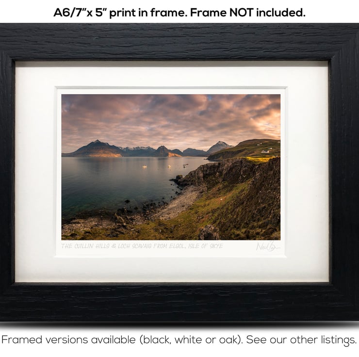 Supplied already mounted, wrapped & with signed labels & certificate, the image is printed on A6 size fine art paper (148x105mm). The actual image size is smaller (see listing images for sizes - image approx. 115x77mm) to allow for the signature & inscription. The 100% acid-free mount is cut to fit standard ready-made frames from high street stores. EXTERNAL mount size is 7"x5". This is the OUTSIDE size of the mount (and thus the size your frame should be).