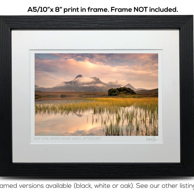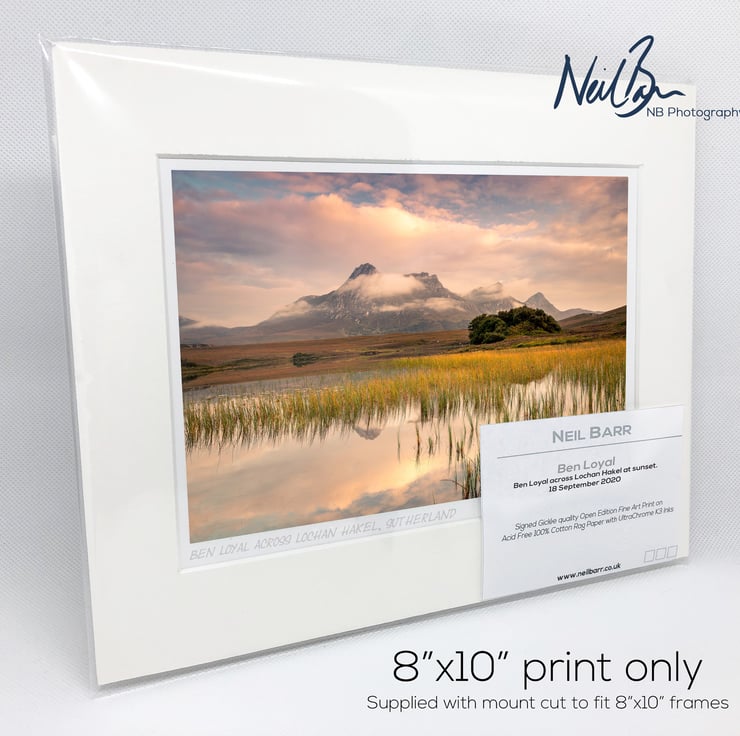 Supplied already mounted, wrapped & with signed labels & certificate, the image is printed on A5 size fine art paper (148x210mm). The actual image size is smaller (see listing images for sizes - image approx. 185x123mm) to allow for the signature & inscription. The 100% acid-free mount is cut to fit standard ready-made frames from high street stores. EXTERNAL mount size is 10"x8". This is the OUTSIDE size of the mount (and thus the size your frame should be).