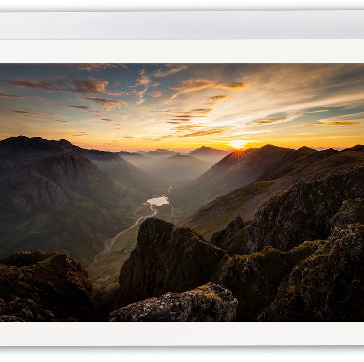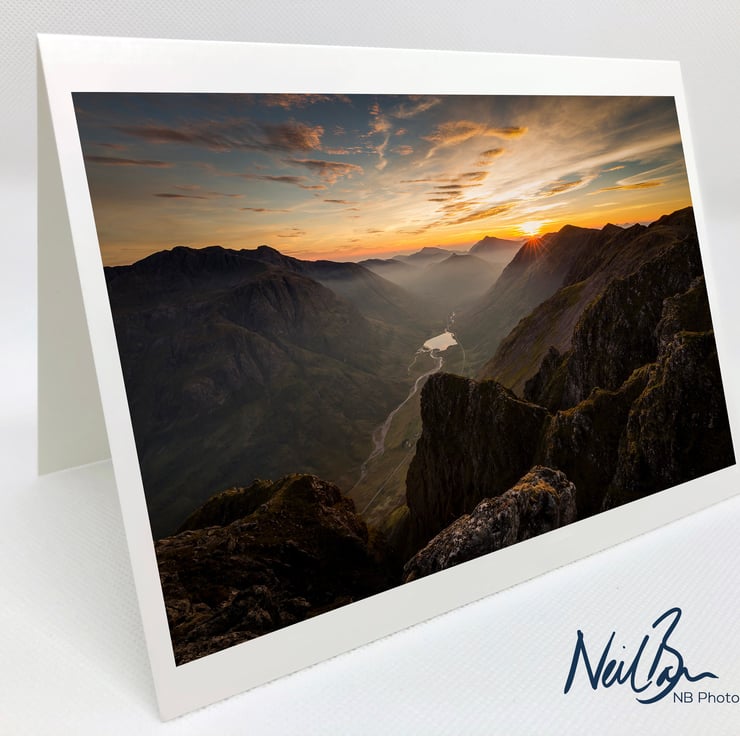 Image: "Glen Coe" - Sun setting over Glen Coe and the Aonach Eagach ridge, from Am Bodach, 29 September 2015 - by Scotland photographer Neil Barr