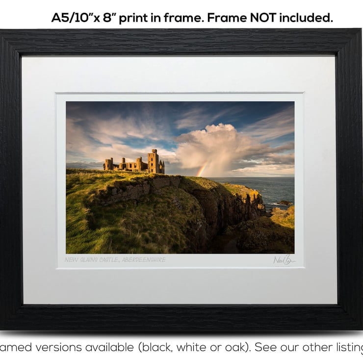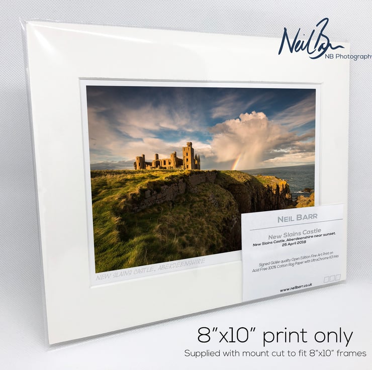 Supplied already mounted, wrapped & with signed labels & certificate, the image is printed on A5 size fine art paper (148x210mm). The actual image size is smaller (see listing images for sizes - image approx. 185x123mm) to allow for the signature & inscription. The 100% acid-free mount is cut to fit standard ready-made frames from high street stores. EXTERNAL mount size is 10"x8". This is the OUTSIDE size of the mount (and thus the size your frame should be).