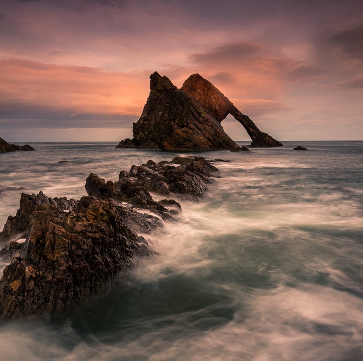 Image: "Bow Fiddle Rock" - Bow Fiddle Rock, Portknockie, at sunset, 30 December 2016 - by Scotland photographer Neil Barr