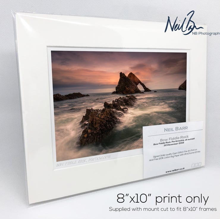 Supplied already mounted, wrapped & with signed labels & certificate, the image is printed on A5 size fine art paper (148x210mm). The actual image size is smaller (see listing images for sizes - image approx. 185x123mm) to allow for the signature & inscription. The 100% acid-free mount is cut to fit standard ready-made frames from high street stores. EXTERNAL mount size is 10"x8". This is the OUTSIDE size of the mount (and thus the size your frame should be).