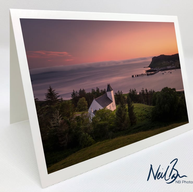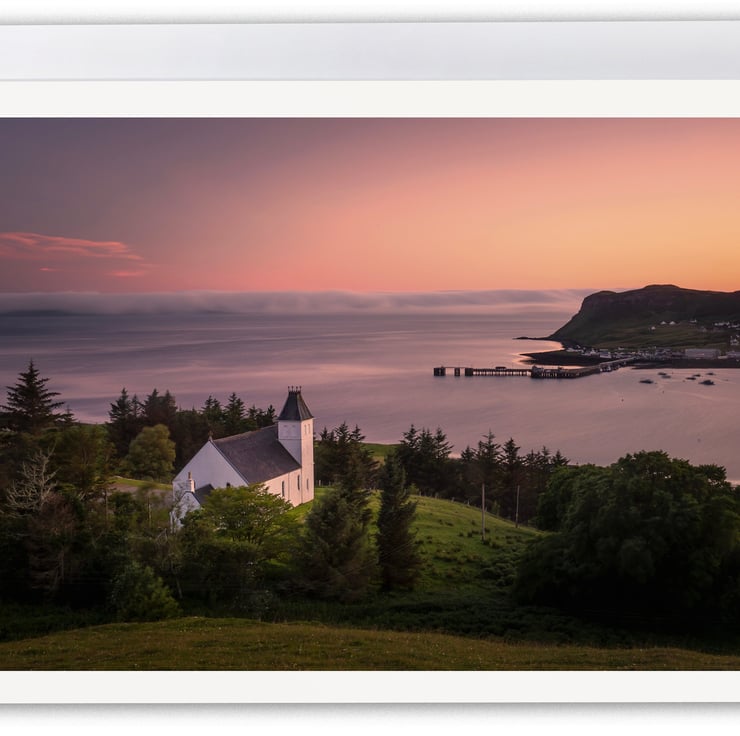 Image: "Uig" - Uig Free Church overlooking Uig Bay and across Loch Snizort to low cloud rolling off the sea and up and over Waternish, Isle of Skye, 27 June 2019 - by Scotland photographer Neil Barr