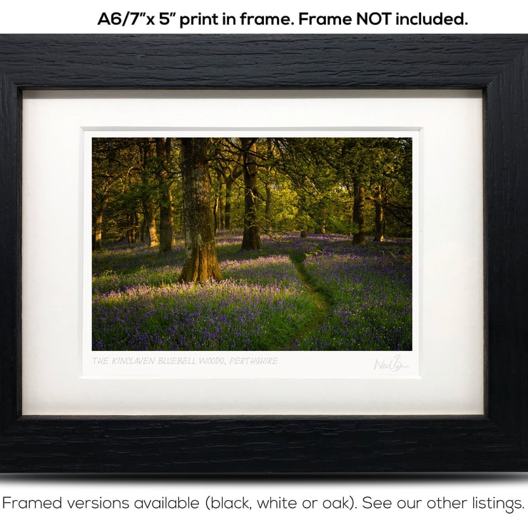 Supplied already mounted, wrapped & with signed labels & certificate, the image is printed on A6 size fine art paper (148x105mm). The actual image size is smaller (see listing images for sizes - image approx. 115x77mm) to allow for the signature & inscription. The 100% acid-free mount is cut to fit standard ready-made frames from high street stores. EXTERNAL mount size is 7"x5". This is the OUTSIDE size of the mount (and thus the size your frame should be).