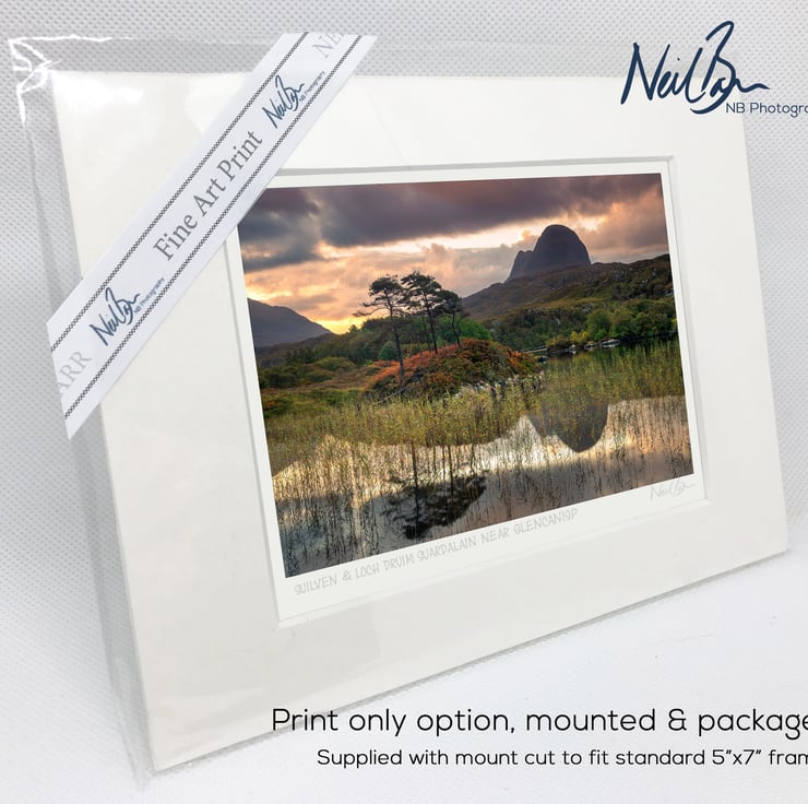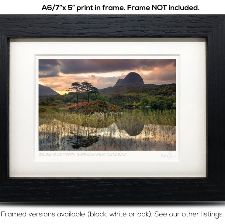 Supplied already mounted, wrapped & with signed labels & certificate, the image is printed on A6 size fine art paper (148x105mm). The actual image size is smaller (see listing images for sizes - image approx. 115x77mm) to allow for the signature & inscription. The 100% acid-free mount is cut to fit standard ready-made frames from high street stores. EXTERNAL mount size is 7"x5". This is the OUTSIDE size of the mount (and thus the size your frame should be).