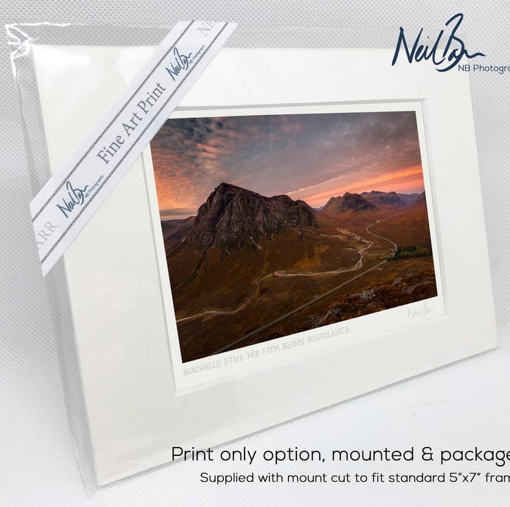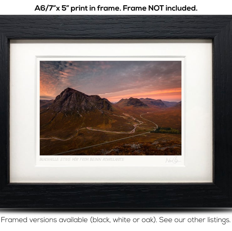 Supplied already mounted, wrapped & with signed labels & certificate, the image is printed on A6 size fine art paper (148x105mm). The actual image size is smaller (see listing images for sizes - image approx. 115x77mm) to allow for the signature & inscription. The 100% acid-free mount is cut to fit standard ready-made frames from high street stores. EXTERNAL mount size is 7"x5". This is the OUTSIDE size of the mount (and thus the size your frame should be).