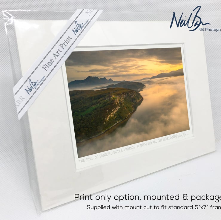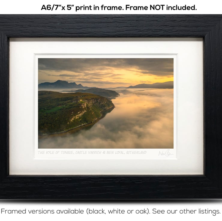 Supplied already mounted, wrapped & with signed labels & certificate, the image is printed on A6 size fine art paper (148x105mm). The actual image size is smaller (see listing images for sizes - image approx. 115x77mm) to allow for the signature & inscription. The 100% acid-free mount is cut to fit standard ready-made frames from high street stores. EXTERNAL mount size is 7"x5". This is the OUTSIDE size of the mount (and thus the size your frame should be).