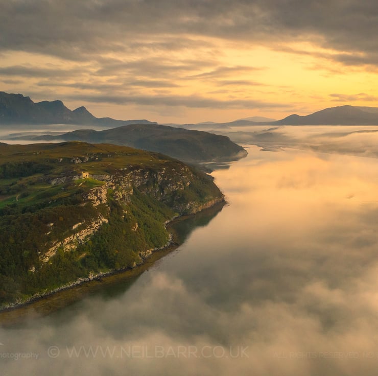 Image: "Kyle of Tongue" - Looking down the Kyle of Tongue past Castle Varrich towards Ben Loyal at sunset, 19 September 2020 - by Scotland photographer Neil Barr
