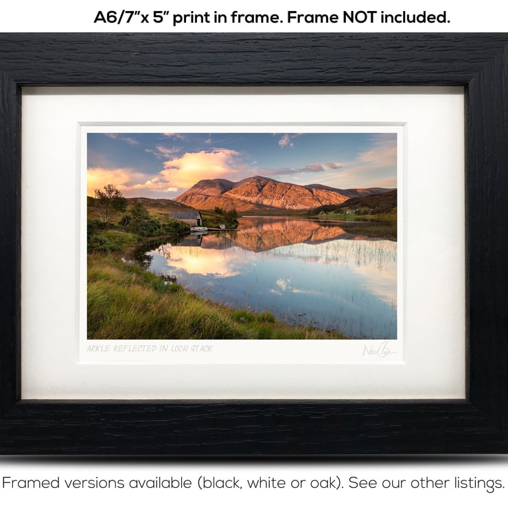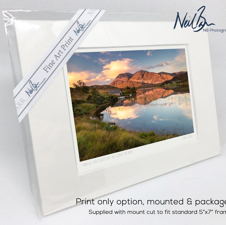 Supplied already mounted, wrapped & with signed labels & certificate, the image is printed on A6 size fine art paper (148x105mm). The actual image size is smaller (see listing images for sizes - image approx. 115x77mm) to allow for the signature & inscription. The 100% acid-free mount is cut to fit standard ready-made frames from high street stores. EXTERNAL mount size is 7"x5". This is the OUTSIDE size of the mount (and thus the size your frame should be).