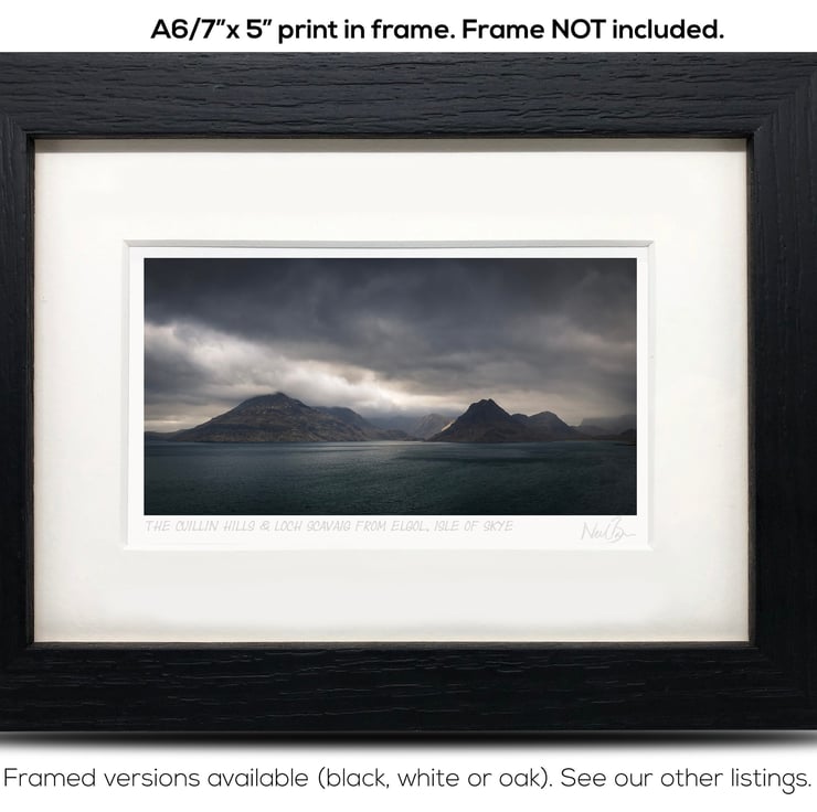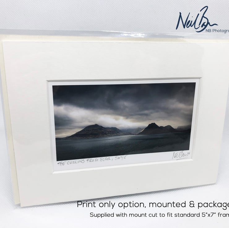 Supplied already mounted, wrapped & with signed labels & certificate, the image is printed on A6 size fine art paper (148x105mm). The actual image size is smaller (see listing images for sizes - image approx. 115x60mm) to allow for the signature & inscription. The 100% acid-free mount is cut to fit standard ready-made frames from high street stores. EXTERNAL mount size is 7"x5". This is the OUTSIDE size of the mount (and thus the size your frame should be).