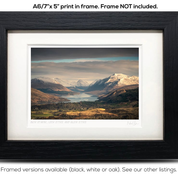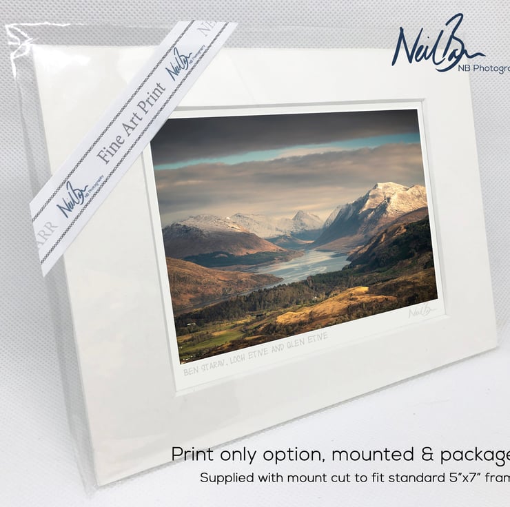 Supplied already mounted, wrapped & with signed labels & certificate, the image is printed on A6 size fine art paper (148x105mm). The actual image size is smaller (see listing images for sizes - image approx. 115x77mm) to allow for the signature & inscription. The 100% acid-free mount is cut to fit standard ready-made frames from high street stores. EXTERNAL mount size is 7"x5". This is the OUTSIDE size of the mount (and thus the size your frame should be).