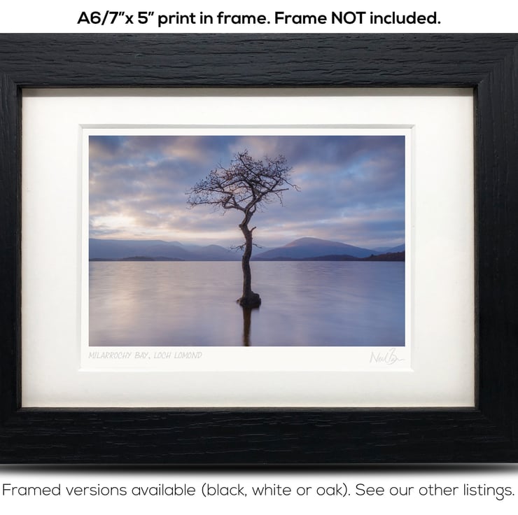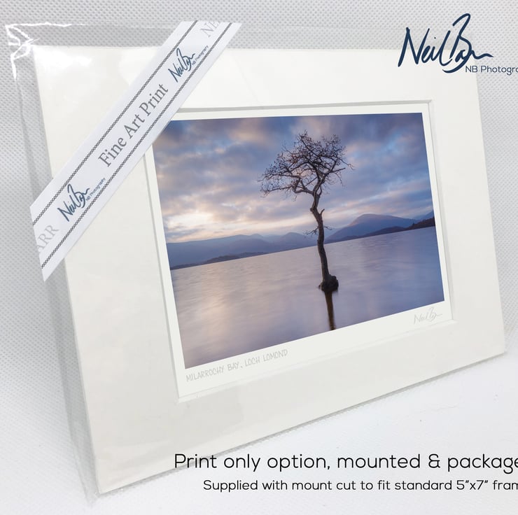 Supplied already mounted, wrapped & with signed labels & certificate, the image is printed on A6 size fine art paper (148x105mm). The actual image size is smaller (see listing images for sizes - image approx. 115x77mm) to allow for the signature & inscription. The 100% acid-free mount is cut to fit standard ready-made frames from high street stores. EXTERNAL mount size is 7"x5". This is the OUTSIDE size of the mount (and thus the size your frame should be).
