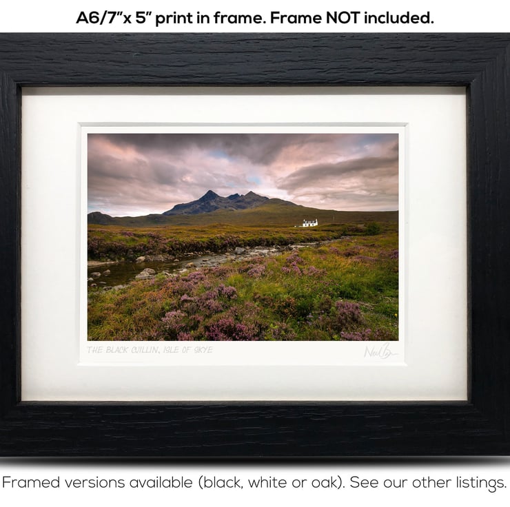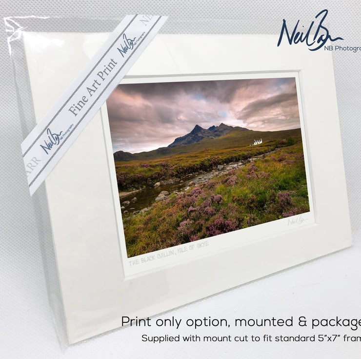 Supplied already mounted, wrapped & with signed labels & certificate, the image is printed on A6 size fine art paper (148x105mm). The actual image size is smaller (see listing images for sizes - image approx. 115x77mm) to allow for the signature & inscription. The 100% acid-free mount is cut to fit standard ready-made frames from high street stores. EXTERNAL mount size is 7"x5". This is the OUTSIDE size of the mount (and thus the size your frame should be).