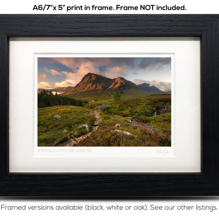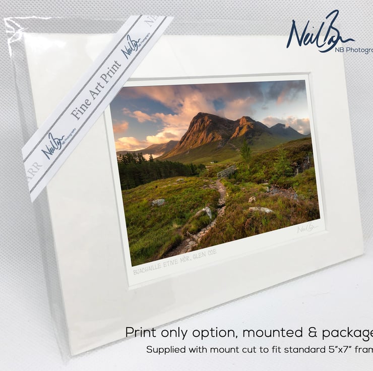 Supplied already mounted, wrapped & with signed labels & certificate, the image is printed on A6 size fine art paper (148x105mm). The actual image size is smaller (see listing images for sizes - image approx. 115x77mm) to allow for the signature & inscription. The 100% acid-free mount is cut to fit standard ready-made frames from high street stores. EXTERNAL mount size is 7"x5". This is the OUTSIDE size of the mount (and thus the size your frame should be).