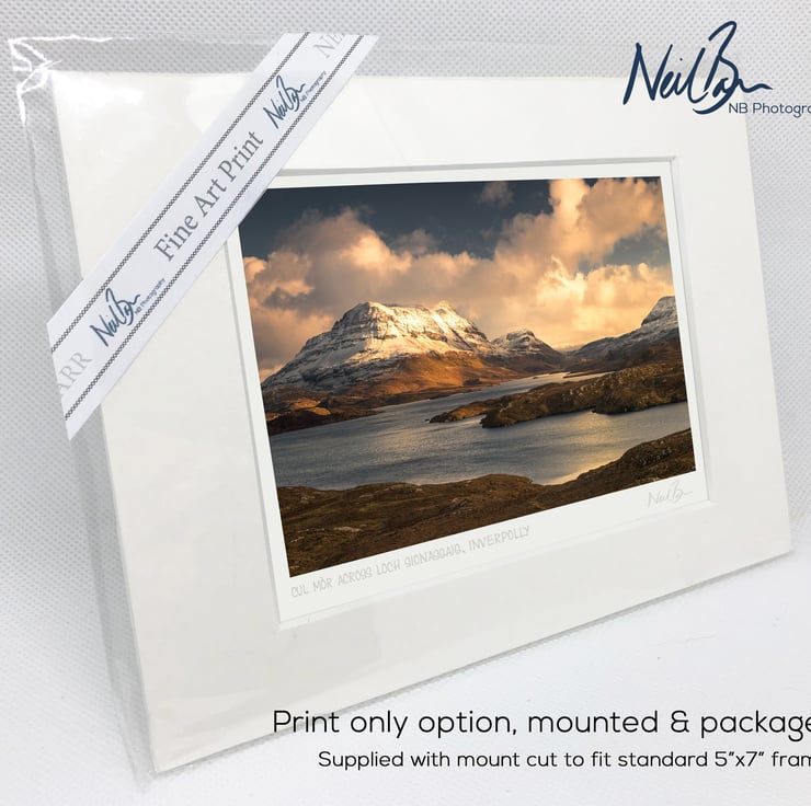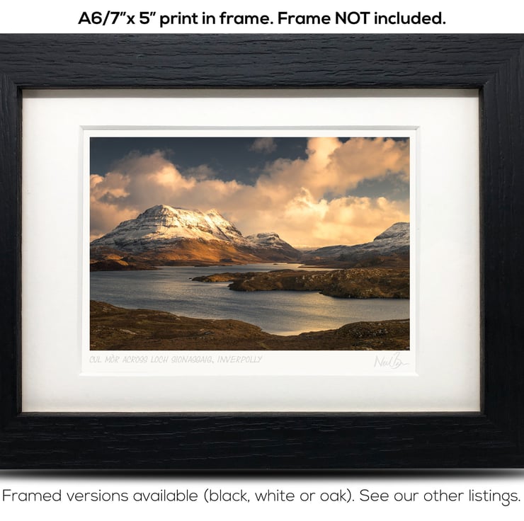Supplied already mounted, wrapped & with signed labels & certificate, the image is printed on A6 size fine art paper (148x105mm). The actual image size is smaller (see listing images for sizes - image approx. 115x77mm) to allow for the signature & inscription. The 100% acid-free mount is cut to fit standard ready-made frames from high street stores. EXTERNAL mount size is 7"x5". This is the OUTSIDE size of the mount (and thus the size your frame should be).