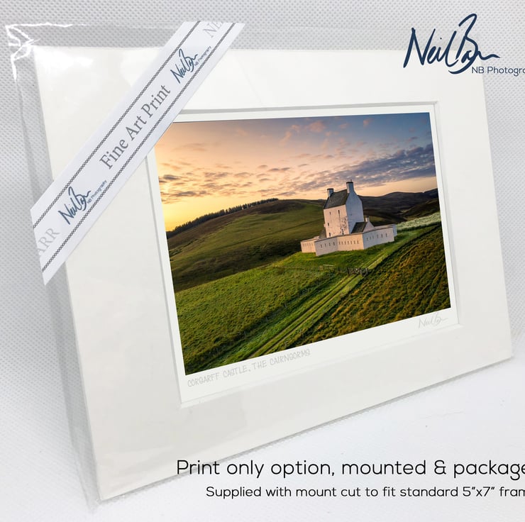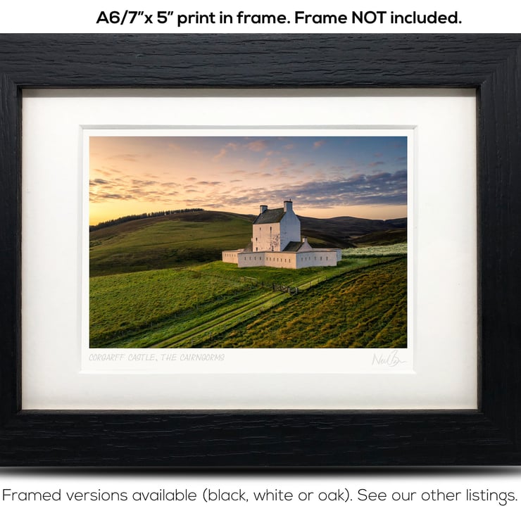 Supplied already mounted, wrapped & with signed labels & certificate, the image is printed on A6 size fine art paper (148x105mm). The actual image size is smaller (see listing images for sizes - image approx. 115x77mm) to allow for the signature & inscription. The 100% acid-free mount is cut to fit standard ready-made frames from high street stores. EXTERNAL mount size is 7"x5". This is the OUTSIDE size of the mount (and thus the size your frame should be).