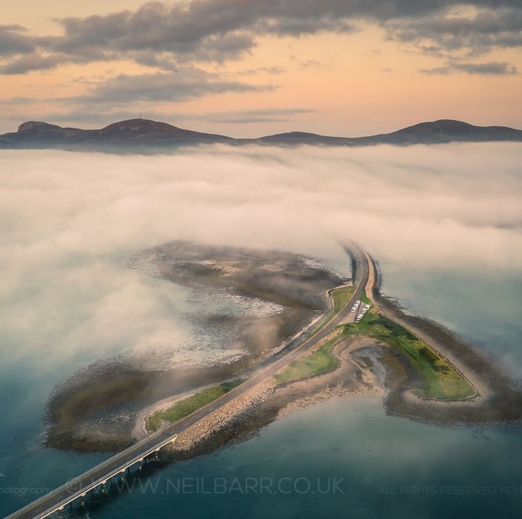 Image: "Kyle of Tongue" - The Kyle of Tongue Bridge and Causeway at sunset as mist and sea fog drifts in, 19 September 2020 - by Scotland photographer Neil Barr
