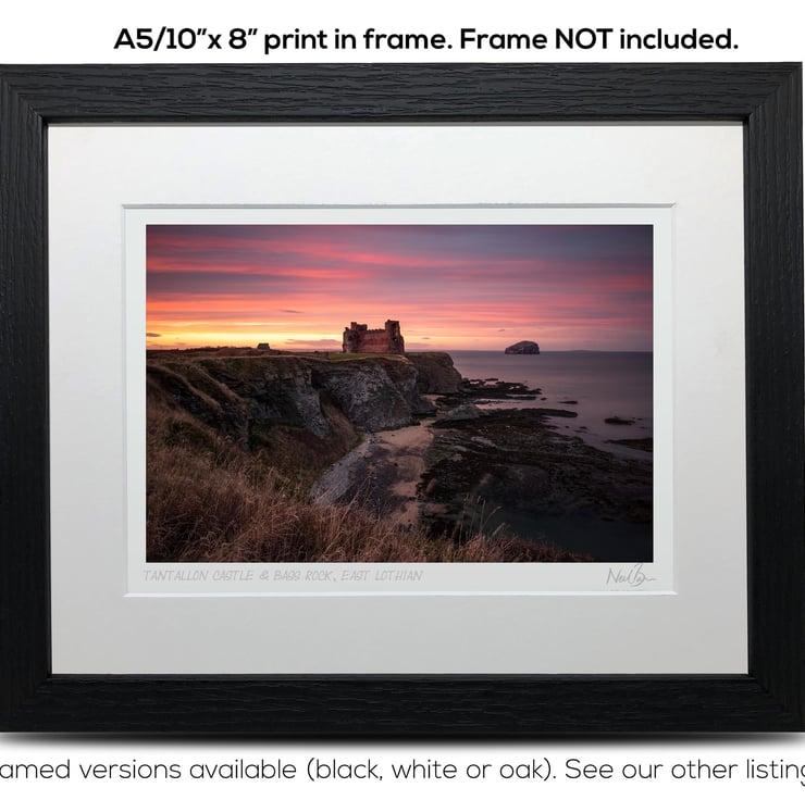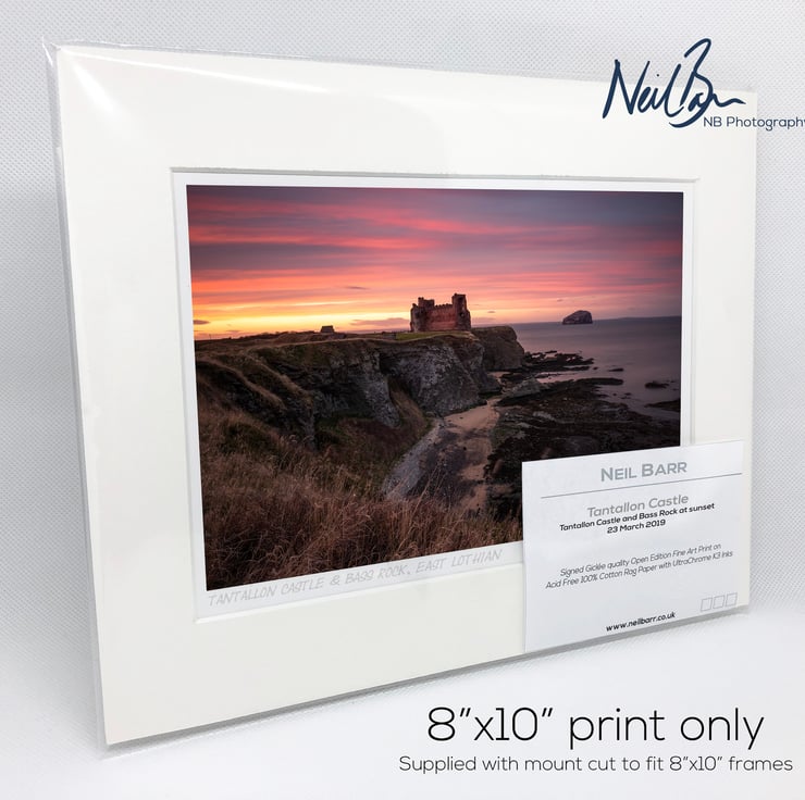Supplied already mounted, wrapped & with signed labels & certificate, the image is printed on A5 size fine art paper (148x210mm). The actual image size is smaller (see listing images for sizes - image approx. 185x123mm) to allow for the signature & inscription. The 100% acid-free mount is cut to fit standard ready-made frames from high street stores. EXTERNAL mount size is 10"x8". This is the OUTSIDE size of the mount (and thus the size your frame should be).
