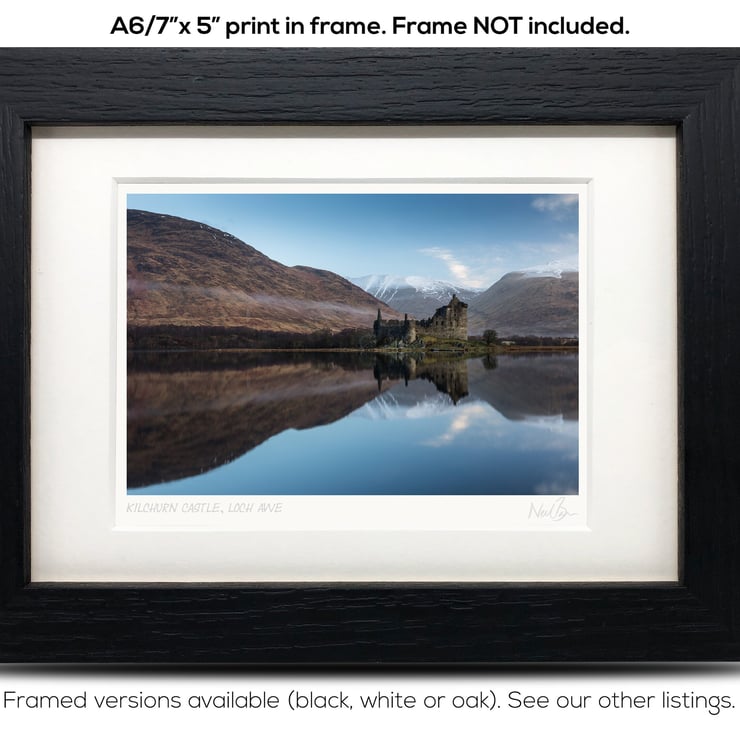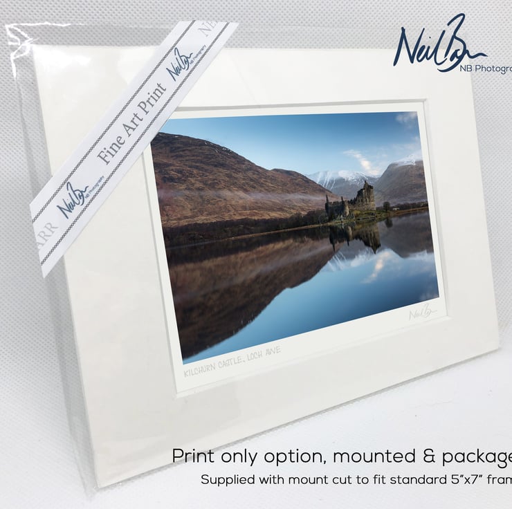 Supplied already mounted, wrapped & with signed labels & certificate, the image is printed on A6 size fine art paper (148x105mm). The actual image size is smaller (see listing images for sizes - image approx. 115x77mm) to allow for the signature & inscription. The 100% acid-free mount is cut to fit standard ready-made frames from high street stores. EXTERNAL mount size is 7"x5". This is the OUTSIDE size of the mount (and thus the size your frame should be).