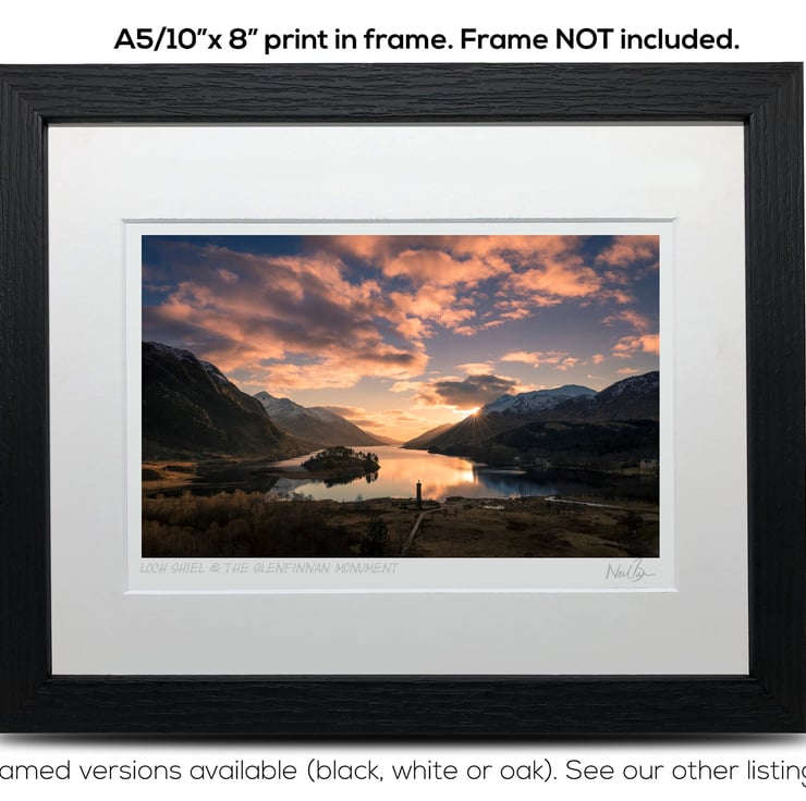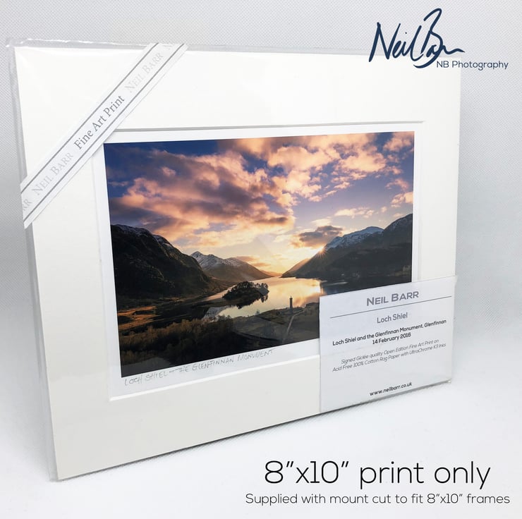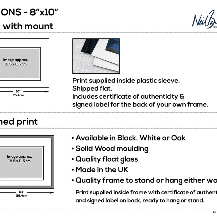 Supplied already mounted, wrapped & with signed labels & certificate, the image is printed on A5 size fine art paper (148x210mm). The actual image size is smaller (see listing images for sizes - image approx. 185x115mm) to allow for the signature & inscription. The 100% acid-free mount is cut to fit standard ready-made frames from high street stores. EXTERNAL mount size is 10"x8". This is the OUTSIDE size of the mount (and thus the size your frame should be).