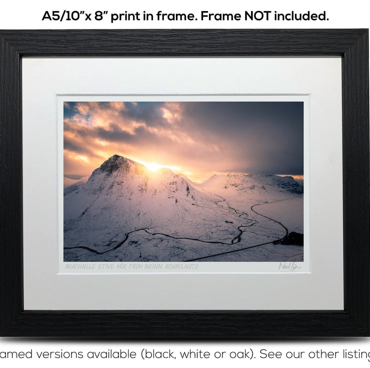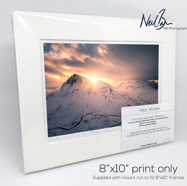 Supplied already mounted, wrapped & with signed labels & certificate, the image is printed on A5 size fine art paper (148x210mm). The actual image size is smaller (see listing images for sizes - image approx. 185x123mm) to allow for the signature & inscription. The 100% acid-free mount is cut to fit standard ready-made frames from high street stores. EXTERNAL mount size is 10"x8". This is the OUTSIDE size of the mount (and thus the size your frame should be).