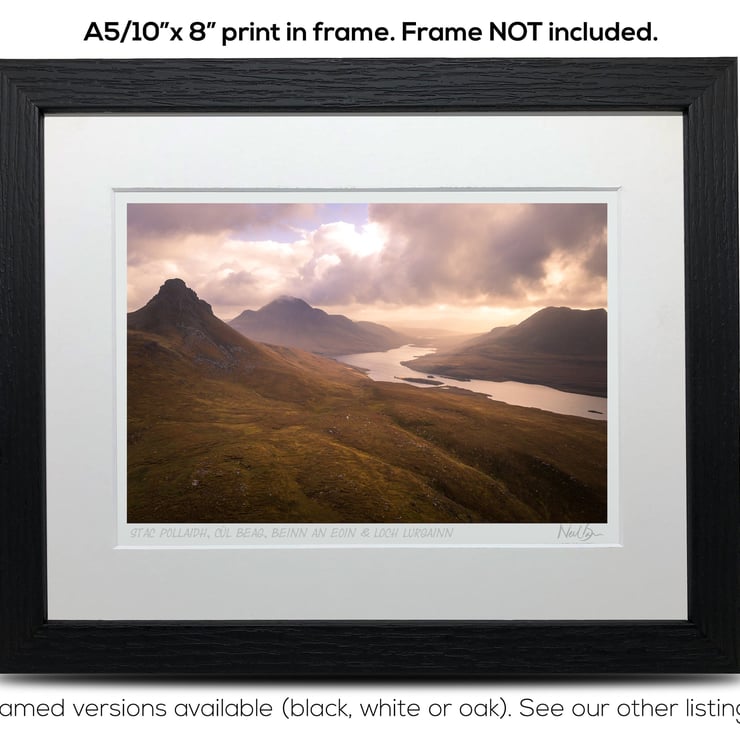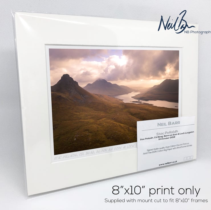 Supplied already mounted, wrapped & with signed labels & certificate, the image is printed on A5 size fine art paper (148x210mm). The actual image size is smaller (see listing images for sizes - image approx. 185x123mm) to allow for the signature & inscription. The 100% acid-free mount is cut to fit standard ready-made frames from high street stores. EXTERNAL mount size is 10"x8". This is the OUTSIDE size of the mount (and thus the size your frame should be).