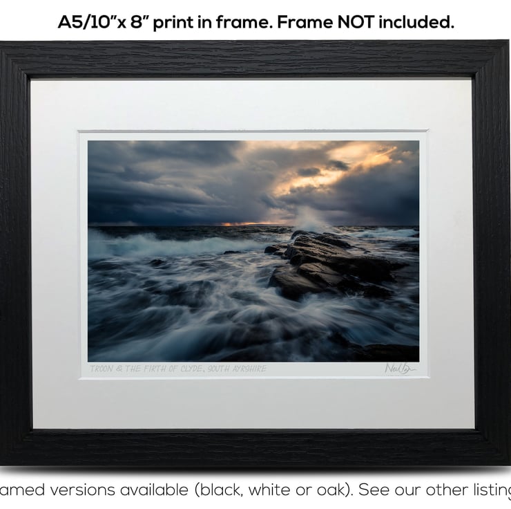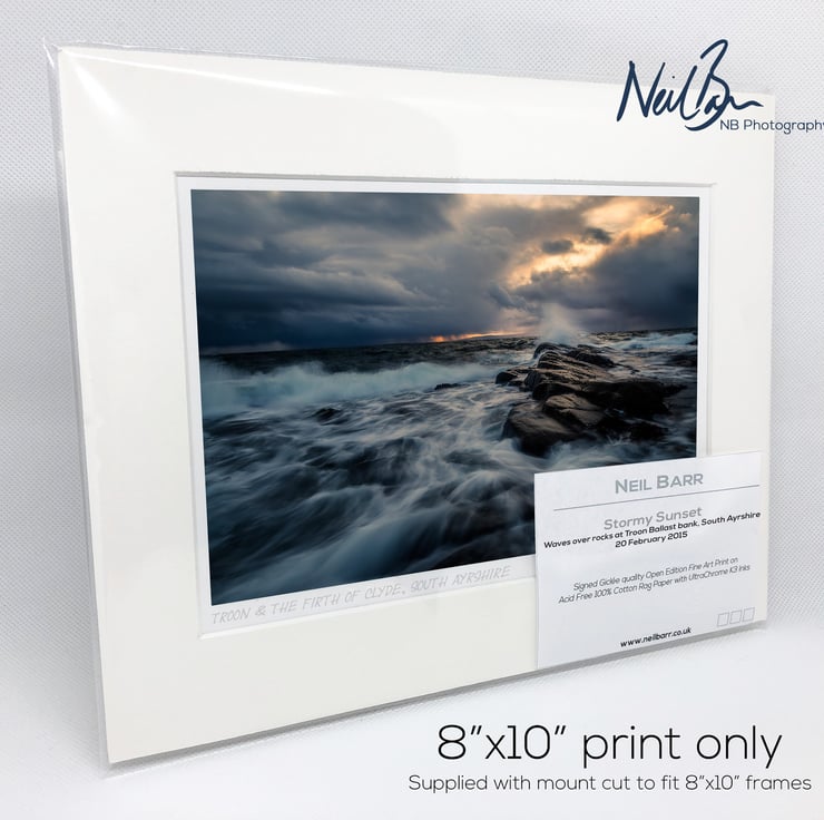 Supplied already mounted, wrapped & with signed labels & certificate, the image is printed on A5 size fine art paper (148x210mm). The actual image size is smaller (see listing images for sizes - image approx. 185x123mm) to allow for the signature & inscription. The 100% acid-free mount is cut to fit standard ready-made frames from high street stores. EXTERNAL mount size is 10"x8". This is the OUTSIDE size of the mount (and thus the size your frame should be).