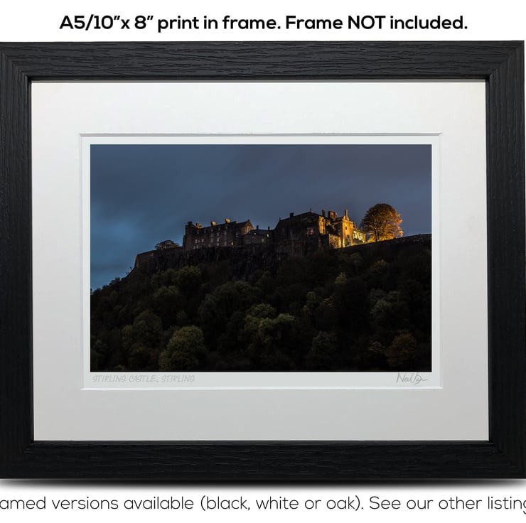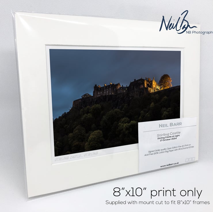 Supplied already mounted, wrapped & with signed labels & certificate, the image is printed on A5 size fine art paper (148x210mm). The actual image size is smaller (see listing images for sizes - image approx. 185x123mm) to allow for the signature & inscription. The 100% acid-free mount is cut to fit standard ready-made frames from high street stores. EXTERNAL mount size is 10"x8". This is the OUTSIDE size of the mount (and thus the size your frame should be).