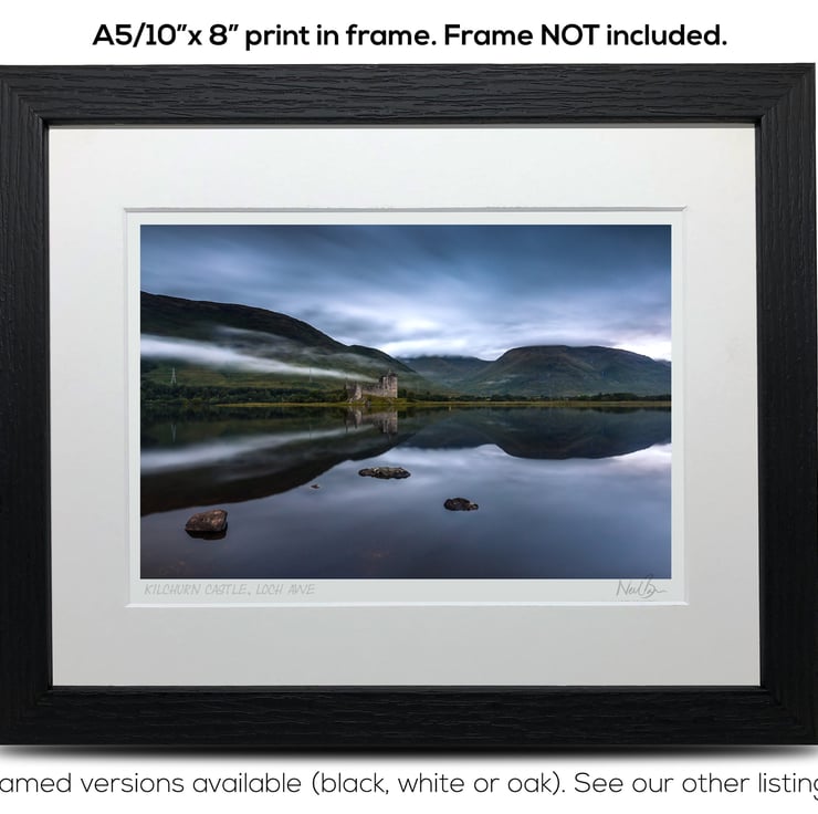 Supplied already mounted, wrapped & with signed labels & certificate, the image is printed on A5 size fine art paper (148x210mm). The actual image size is smaller (see listing images for sizes - image approx. 185x123mm) to allow for the signature & inscription. The 100% acid-free mount is cut to fit standard ready-made frames from high street stores. EXTERNAL mount size is 10"x8". This is the OUTSIDE size of the mount (and thus the size your frame should be).