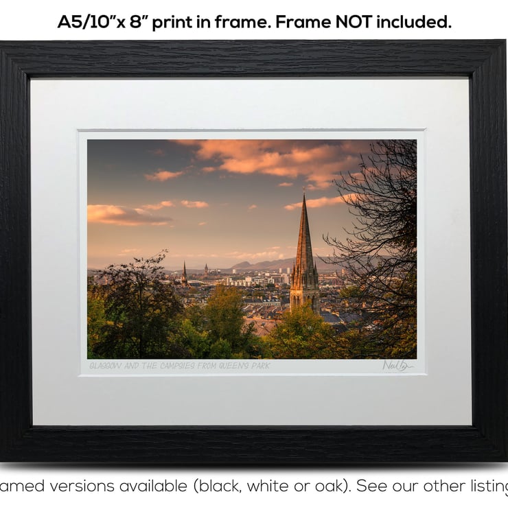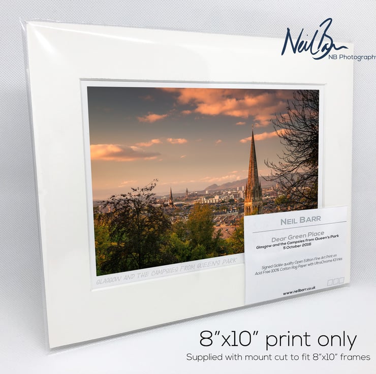Supplied already mounted, wrapped & with signed labels & certificate, the image is printed on A5 size fine art paper (148x210mm). The actual image size is smaller (see listing images for sizes - image approx. 185x123mm) to allow for the signature & inscription. The 100% acid-free mount is cut to fit standard ready-made frames from high street stores. EXTERNAL mount size is 10"x8". This is the OUTSIDE size of the mount (and thus the size your frame should be).