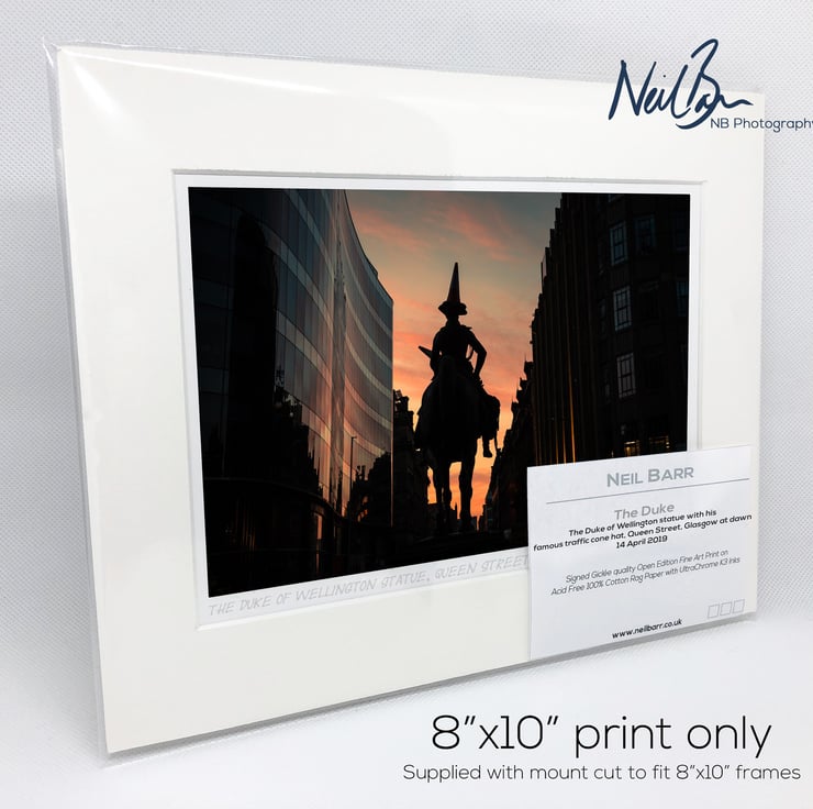 Supplied already mounted, wrapped & with signed labels & certificate, the image is printed on A5 size fine art paper (148x210mm). The actual image size is smaller (see listing images for sizes - image approx. 185x123mm) to allow for the signature & inscription. The 100% acid-free mount is cut to fit standard ready-made frames from high street stores. EXTERNAL mount size is 10"x8". This is the OUTSIDE size of the mount (and thus the size your frame should be).