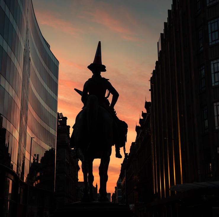 Image: "The Duke" - The Duke of Wellington statue with his famous traffic cone hat, Queen Street, Glasgow at dawn, 14 April 2018 - by Scotland photographer Neil Barr